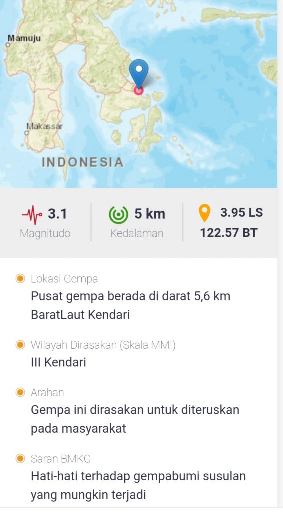 “Pusat gempa berada di darat, 5,6 kilometer Barat Laut Kendari,” tulis akun Twitter resmi BMKG RI