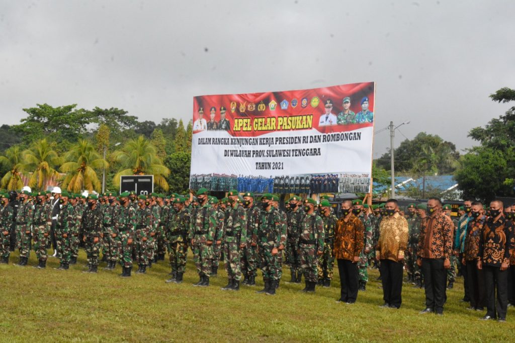 Seluruh rangkaian kegiatan Apel Gelar Pasukan Pam VVIP dalam rangka Kunjungan Kerja Presiden RI Ir Joko Widodo di Sulawesi Tenggara menerapkan protokol kesehatan Covid 19.