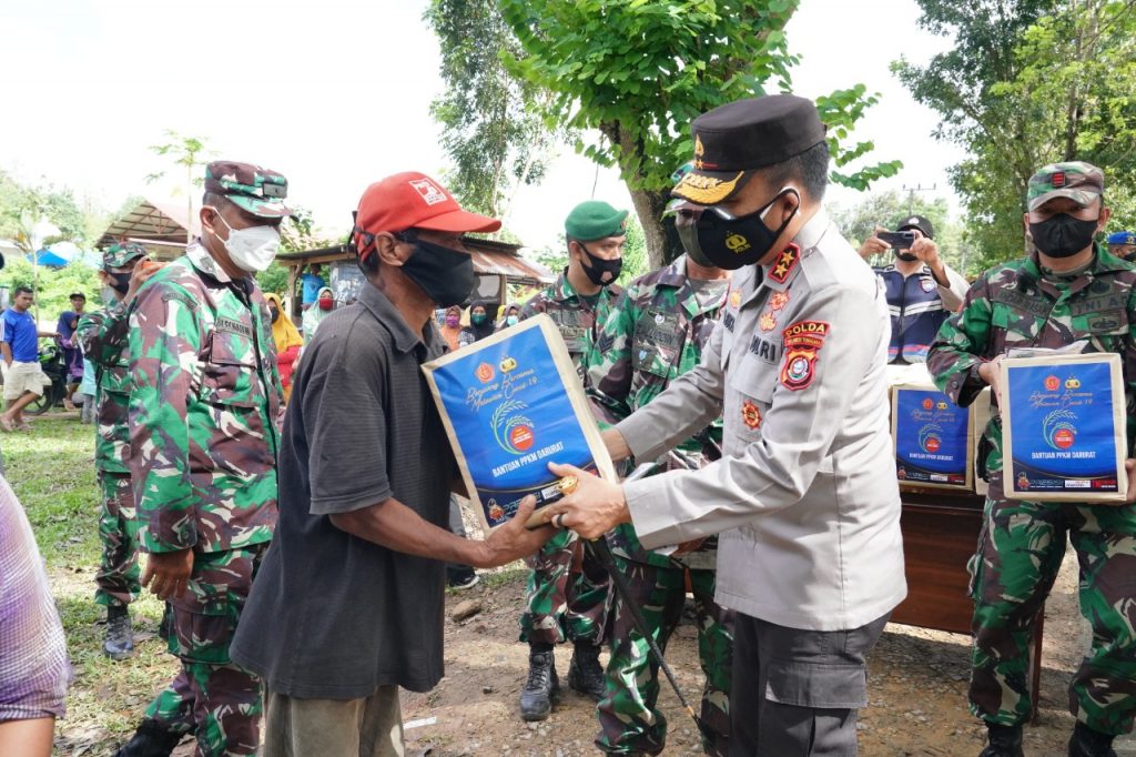 Kendari – Untuk mengisi perayaan HUT ke – 76 RI dalam kondisi PPKM darurat berskala Mikro, Korem 143/HO dan Polda Sultra bersama Bank Mandiri membagikan Bansos kepada masyarakat yang terdampak pandemi.