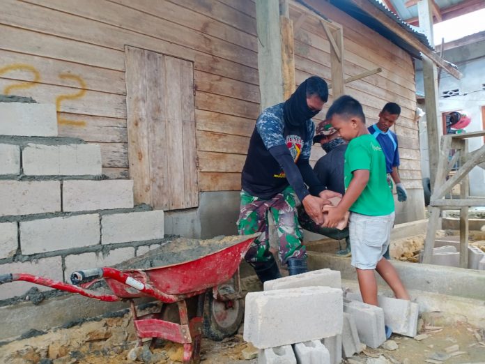 Kendari_ Hubungan Satgas Pra TNI Manunggal Mambangun Desa (TMMD) ke-112 Kodim 1417/Kendari bersama warga sampai anak-anak Kelurahan Lalodati Kecamatan Puuwatu Kota Kendari di lokasi sasaran fisik RTLH terjalin semakin mesra, Kamis (02/09/2021).