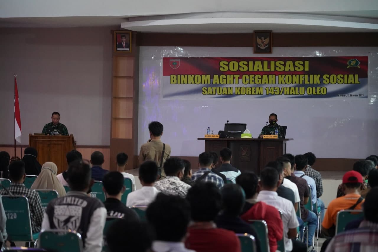 Kendari – Sosialisasi Pembinaan Komunikasi (Binkom) Ancaman, Gangguan, Hambatan dan Tantangan (AGHT) Cegah Konflik Sosial kepada segenap komponen masyarakat di wilayah Provinsi Sultra diselenggarakan oleh Korem 143/HO bertempat di Aula Jenderal Soedirman, Selasa (12/10/2021)