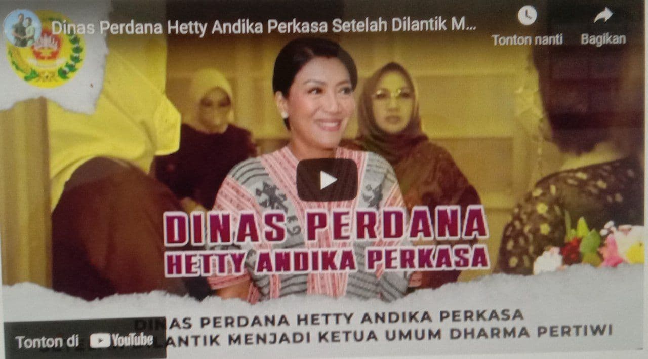 Hetty Andika Perkasa setelah serah terima jabatan menjadi Ketua Umum Dharma Pertiwi, Dan Ketua Umum Ikatan Kesejahteraan Keluarga TNI (IKKT) Pragati Wira Anggini, menjalankan tugas dinas perdana di Kantor Dharma Pertiwi Pengurus Pusat.