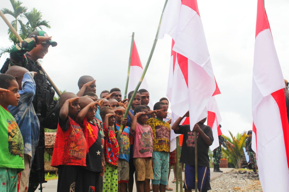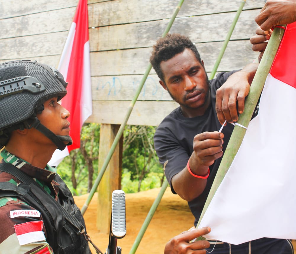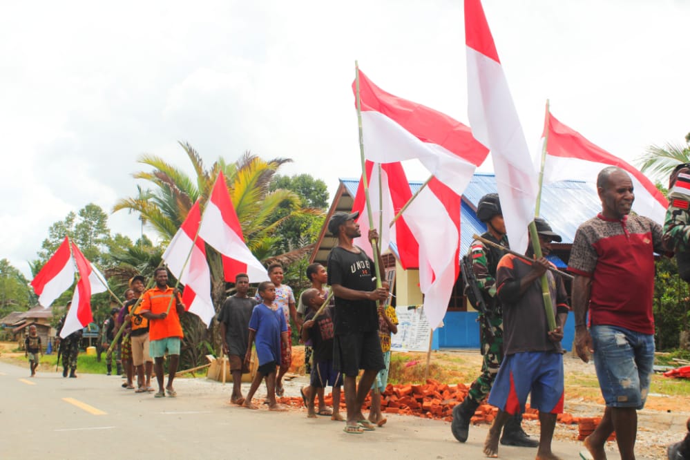 “Pembagian dan pemasangan bendera Merah Putih dilakukan bersama masyarakat di Kp. Ichan, Distrik Waropko ini, selain bersilaturahmi dengan masyarakat, juga memotivasi dan mengajak masyarakat bersama-sama menghayati arti kemerdekaan serta memupuk rasa nasionalisme akan cinta tanah air”, kata Syafruddin.