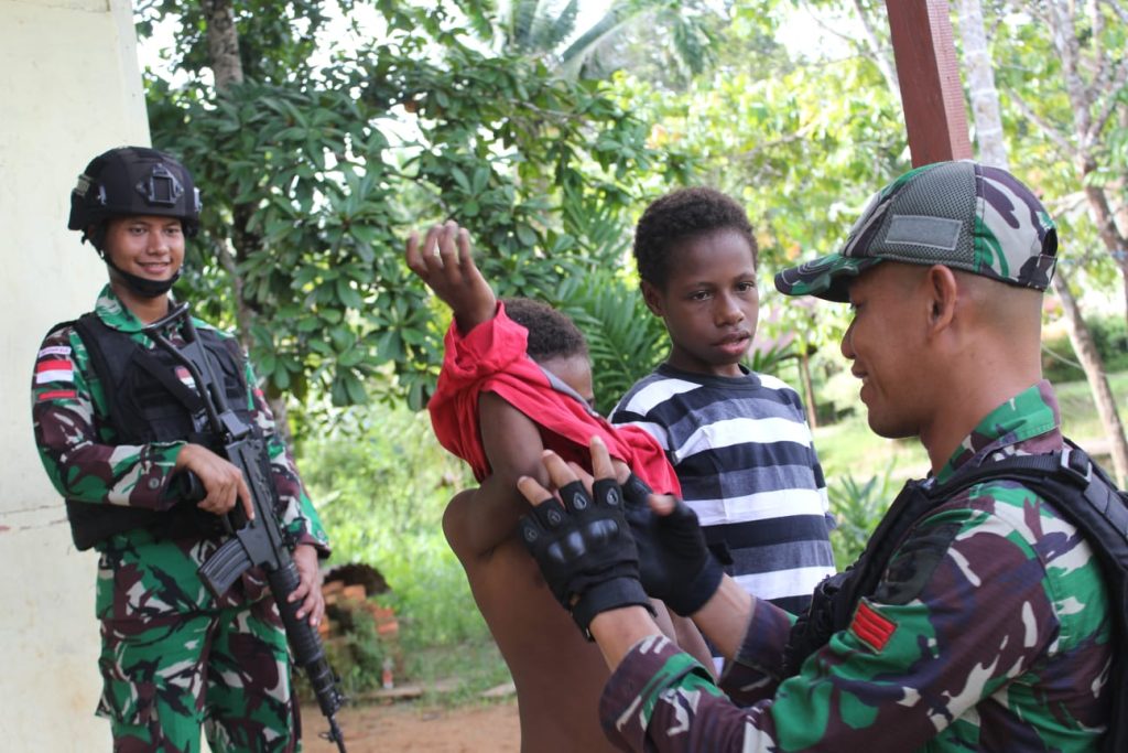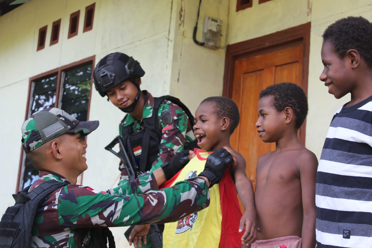 Boven Digoel – Wujud perhatian kepada masyarakat wilayah perbatasan, Satgas Pamtas Yonif 725/Woroagi Pos Kout dibawah naungan Kolakops Korem 174/ATW memberikan pakaian layak pakai kepada anak-anak warga Kampung Mawan, Distrik Mandobo, Kabupaten Boven Digoel, Papua Selatan. Rabu, (23/11/22).