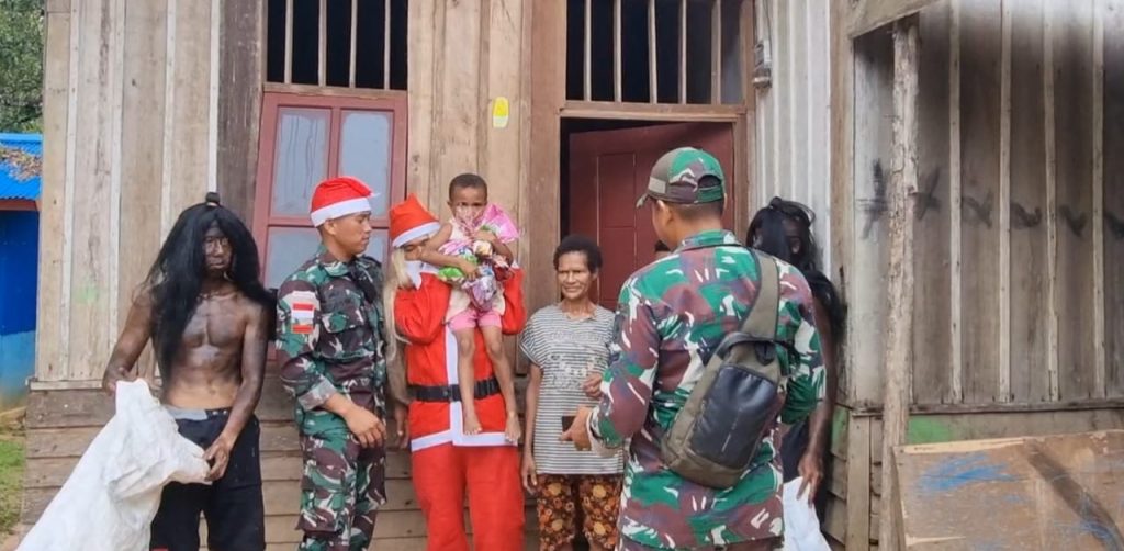 Hal tersebutlah yang dilakukan oleh Satgas Yonif 725/Woroagi dengan mendatangi rumah warga utamanya yang memiliki anak kecil dilengkapi Karakter-karakter khas Natal yaitu Santa Claus dan Piet Hitam memberikan Kado Natal.