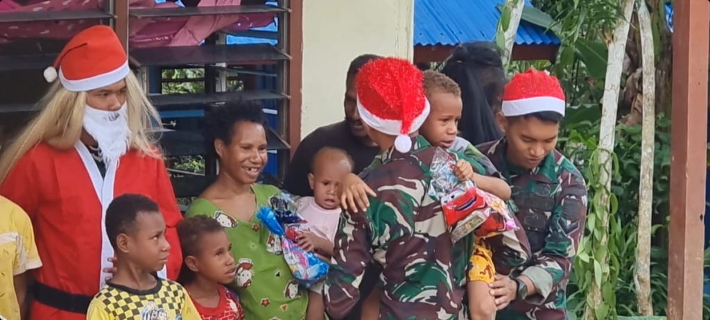 Boven Digoel – Meriahkan Hari Natal 2022, Satgas Pamtas RI-PNG Yonif 725/Woroagi yang berada di bawah naungan Kolakops Korem 174/ATW gelar aksi Santa Claus dan Pit Hitam door to door di Kp. Mawan, Distrik Mandobo, Kab. Boven Digoel, Papua Selatan. Kamis, (22/12/22).
