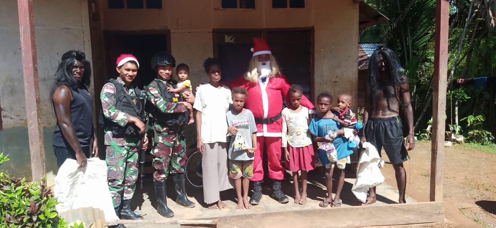 Hal tersebutlah yang dilakukan oleh Satgas Yonif 725/Woroagi dengan mendatangi rumah warga utamanya yang memiliki anak kecil dilengkapi Karakter-karakter khas Natal yaitu Santa Claus dan Piet Hitam memberikan Kado Natal.