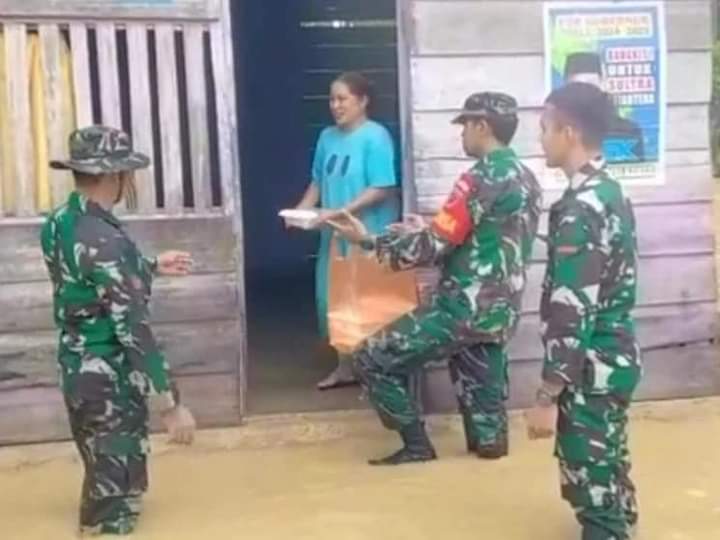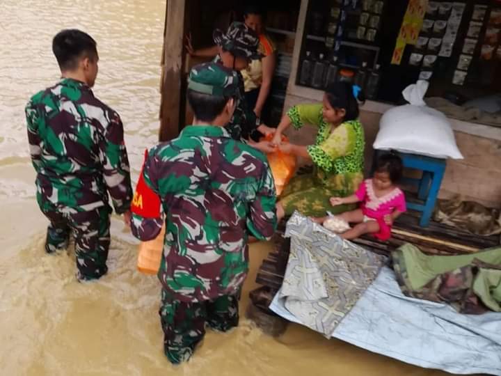 Koramil-12/Poleang Kodim 1413/Buton turun langsung membantu, sekaligus membagikan makanan siap saji dan air mineral secara gratis kepada warga terdampak banjir di Desa Lameong Meong Kecamatan Poleang Barat Kabupaten Bombana Provinsi Sulawesi Tenggara.