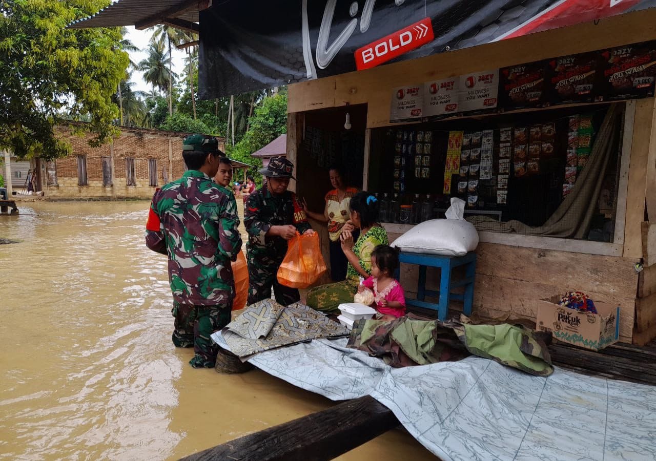 Koramil-12/Poleang Kodim 1413/Buton turun langsung membantu, sekaligus membagikan makanan siap saji dan air mineral secara gratis kepada warga terdampak banjir di Desa Lameong Meong Kecamatan Poleang Barat Kabupaten Bombana Provinsi Sulawesi Tenggara.