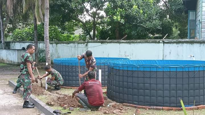 Kodim 1413/Buton melaksanakan program ketahan pangan lewat sektor pertanian yang saat ini sementara berjalan di Desa Gunung Jaya Kec.Siontapina Kab. Buton untuk budidaya ikan air tawar yang menggunakan Kolam Bioflok berada di Kodim 1413/Buton ,Rabu(07/02/2023)