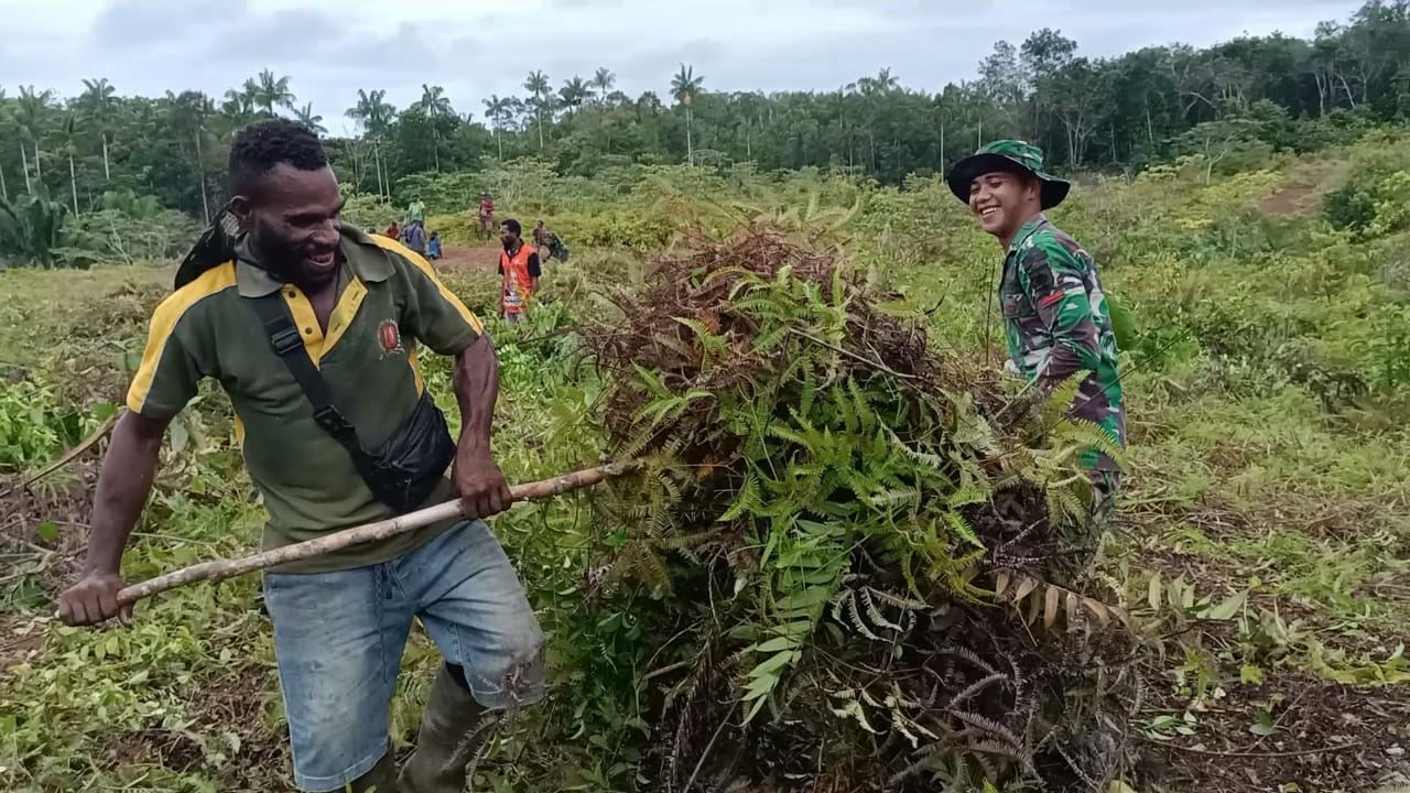 Selasa, 21 Februari 2023. Satgas Pamtas RI-PNG Yonif 725/Woroagi yang berada di bawah naungan Komando Korem 174/ATW, Pos Kombut bersama masyarakat di perbatasan melaksanakan Karya Bakti membersihkan jalan dan lingkungan kampung Kombut dalam rangka menjaga kebersihan di lingkungan Kampung Kombut, yang dilaksanakan di Kampung Kombut, Distrik Kombut, Kab. Boven Digoel.