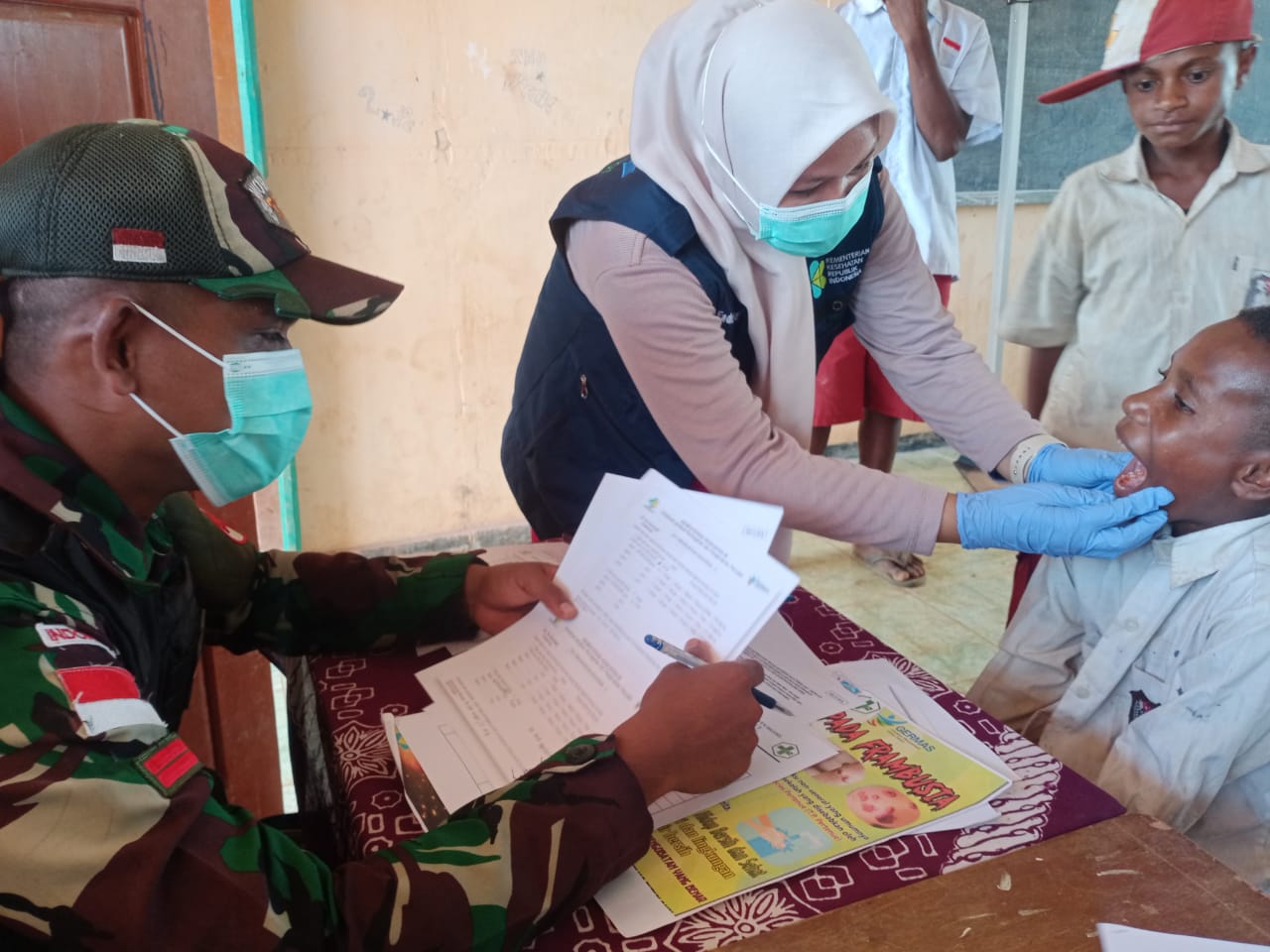 dalam rangka meningkatkan status perkembangan Gizi Serta Kesehatan Anak-anak wilayah perbatasan RI-PNG (Republik Indonesia – Papua New Guinea), Satgas Pamtas Yonif 725/Woroagi yang di bawah naungan Korem 174/ATW Pos Kombut bekerjasama dengan Puskesmas Kombut memberikan layanan kesehatan mulai dari mengecek kesehatan Anak-anak, mengukur tinggi dan berat badan Anak-anak serta setiap Anak diberikan obat cacing di SD. YPPK. ST. Yohanes Kombut Kampung Kombut, Distrik Kombut, Kabupaten Boven Digoel.