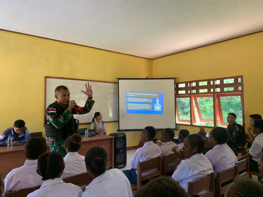 Boven Digoel – Satgas Pamtas RI-PNG Yonif 725/Woroagi dibawah naungan Kolakops Korem 174/ATW melalui Pos 4/A Kalikao yang dipimpin Serka Asrul Saeho, memberikan Wasbang (Wawasan Kebangsaan) bersama Puskesmas dan Pos Imigrasi Waropko kepada Siswa/i SMPN 1 Waropko, Distrik Waropko, Kab. Boven Digoel, Papua Selatan. Selasa, (7/3/2023).