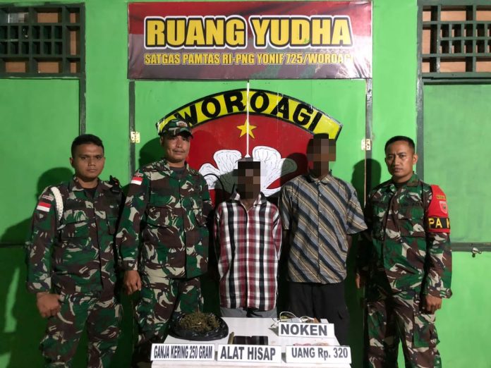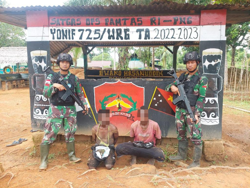 Boven Digoel – Satgas Pamtas RI-PNG (Papua New Guinea) Yonif 725/Wrg dibawah naungan Kolakops Korem 174/ATW melalui Pos KM 53 yang dipimpin Letda Inf Ld. Abubakar kembali berhasil menangkap 2 orang pemuda berinisial “K” (18) dan “J” (17) pelaku pengedar Narkoba jenis Ganja seberat ±250 gr di Kampung Kanggup, Distrik Sesnuk, Kab. Boven Digoel. Minggu, (12/3/2023).