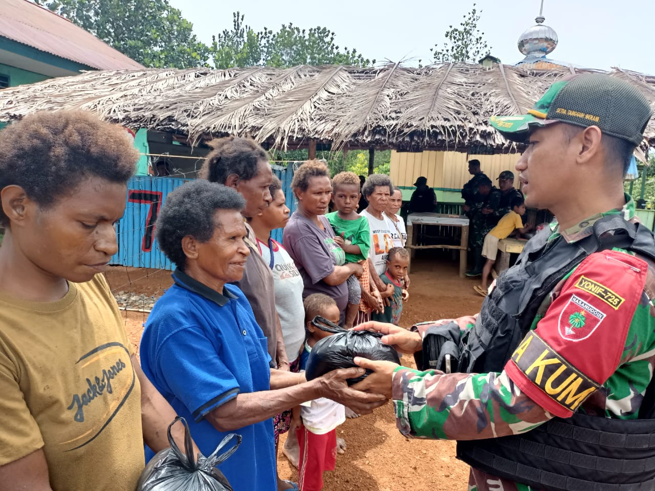 Rabu, 22 Maret 2023, Satgas Pamtas RI-PNG Yonif 725/Woroagi yang berada di bawah naungan Komando Korem 174/ATW, Pos Kombut berbagi kebahagian dengan membagikan sembako kepada masyarakat di wilayah Perbatasan yang dilaksanakan di Kampung Kombut, Distrik Kombut, Kab. Boven Digoel.