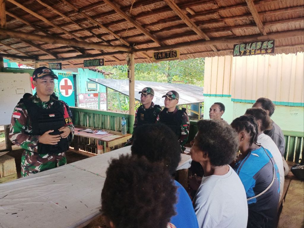 Dalam penyuluhan tersebut, Pakum Satgas Pamtas Yonif 725/Wrg Letda CHK Muchamad Ridho Arfianto SH. menyampaikan materi tentang larangan miras, Bahaya Narkoba dan KDRT serta tindak pidana di Kampung Kombut.