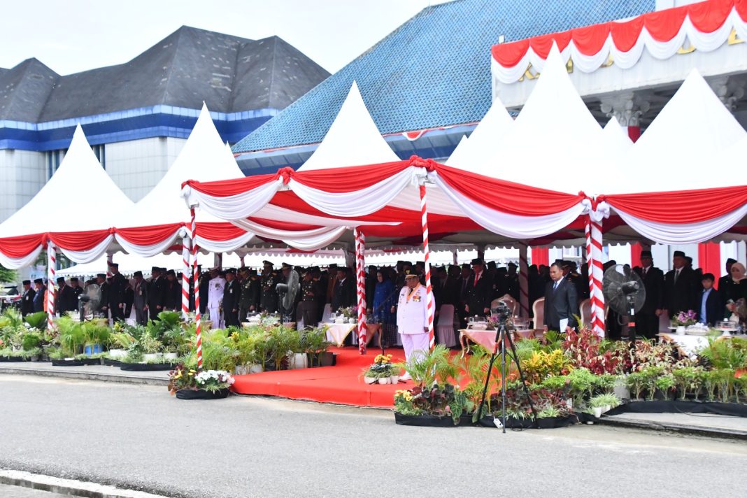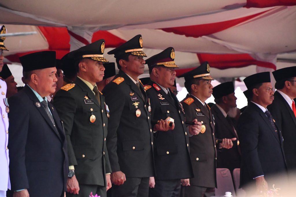 Kendari – Komandan Korem 143/HO Brigjen TNI Ayub Akbar menghadiri upacara peringatan HUT ke- 59 Prov. Sultra yang dipimpin langsung oleh Gubernur Sultra H. Ali Mazi S.H di lapangan Upacara Kantor Gubernur Sultra.