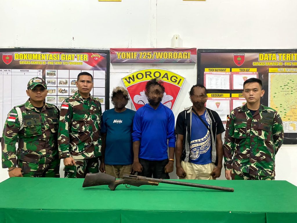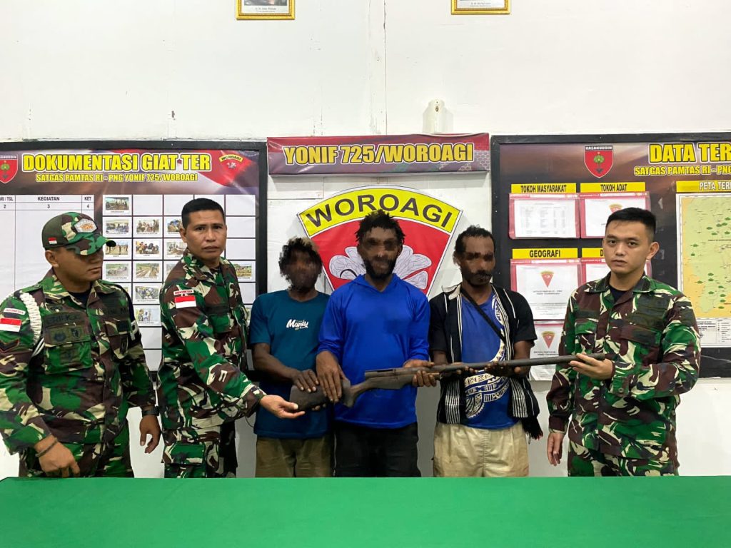 “Berdasarkan laporan yang diterima, Sabtu Sore, Sdr. J.A bersama 2 orang rekannya mendatangi Pos KM 53 sambil membawa barang yang terbungkus karung beras, setelah diterima oleh Danpos KM 53 Letda Inf Ld. Abu Bakar, Sdr. J.A mengaku membawa Senjata jenis Engkeloop dan secara sukarela ingin menyerahkannya kepada Satgas Yonif 725/Woroagi”, Jelas Dansatgas.