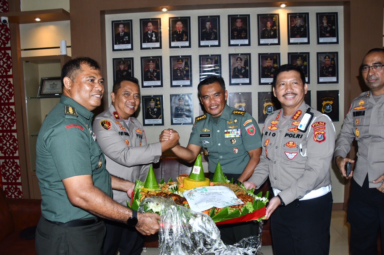 Kendari – Kepala Staf Korem 143/HO Kolonel Inf Singgih Pambudi Arinto, S.I.P., M.M. beserta seluruh pejabat Kasi Kasrem 143/HO memberikan kejutan di Mapolda Sultra dalam rangka HUT ke-77 Bhayangkara.